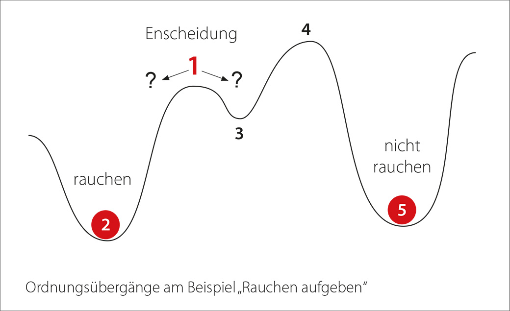 “Bloß, weil ausgerechnet dieser abendliche Termin abgesagt wurde …”. Sind 2 Attraktoren annähernd gleich stark, braucht es nur eine kleine Zufälligkeit, um das endgültige “Hinüberkippen” in einen der beiden Ordnungszustände zu bewirken. In der Systemtheorie gibt es dafür das berühmte Bild der Kugel, die in einer extrem instabilen Lage auf der Spitze eines Berges „ruht“. Jede minimale Bewegung von außen kann sie auf eine der möglichen Seiten kippen lassen und dort wird sie den Hang herunterrollen, angezogen von der Schwerkraft des Attraktors, der dieses Tal beherrscht (siehe auch die Abbildung unten: Ordnungsübergänge am Beispiel „Rauchen aufgeben“).